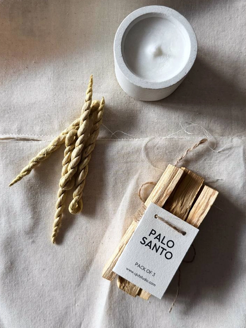 Long-Sleeve or T-short A minimalist litem with a clean, fitted silhouette designed for everyday wear. Made from soft, breathable cotton with a touch of stretch, it gently follows the body without restricting movement. Ideal for layering or wearing on its own from slow mornings to long city days. Palo Santo - A grounding aromatic wood with a warm, calming scent. Used to refresh the space, support meditation, and bring a moment of quiet after a noisy day. Rope Incense (Nepal, Sandalwood) - Handmade, 100% natural rope incense crafted from lokta paper and aromatic herbs with sandalwood, sourced directly from Nepal. Designed to elevate the atmosphere, soothe the mind, and support meditation. Light one end, let it smolder, then place on a heat-resistant tray or in an incense holder. Small Candle - A handmade candle in a concrete vessel, poured with soy wax and fragrance oil, finished with a cotton wick. Minimal, warm, and made for everyday ritual moments.
